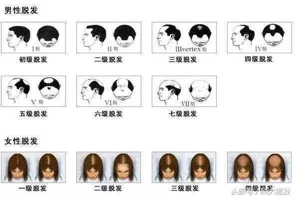 雄激素性秃发典型的临床表现大多先从前额和两侧鬓角开始,呈M型逐渐向头顶延伸,额颞部发际线逐渐向后退缩。也有前发际线和头顶部脱发同时进行的,目前国际公认的脱发分型为 norwood发型,分为7级12个类型。